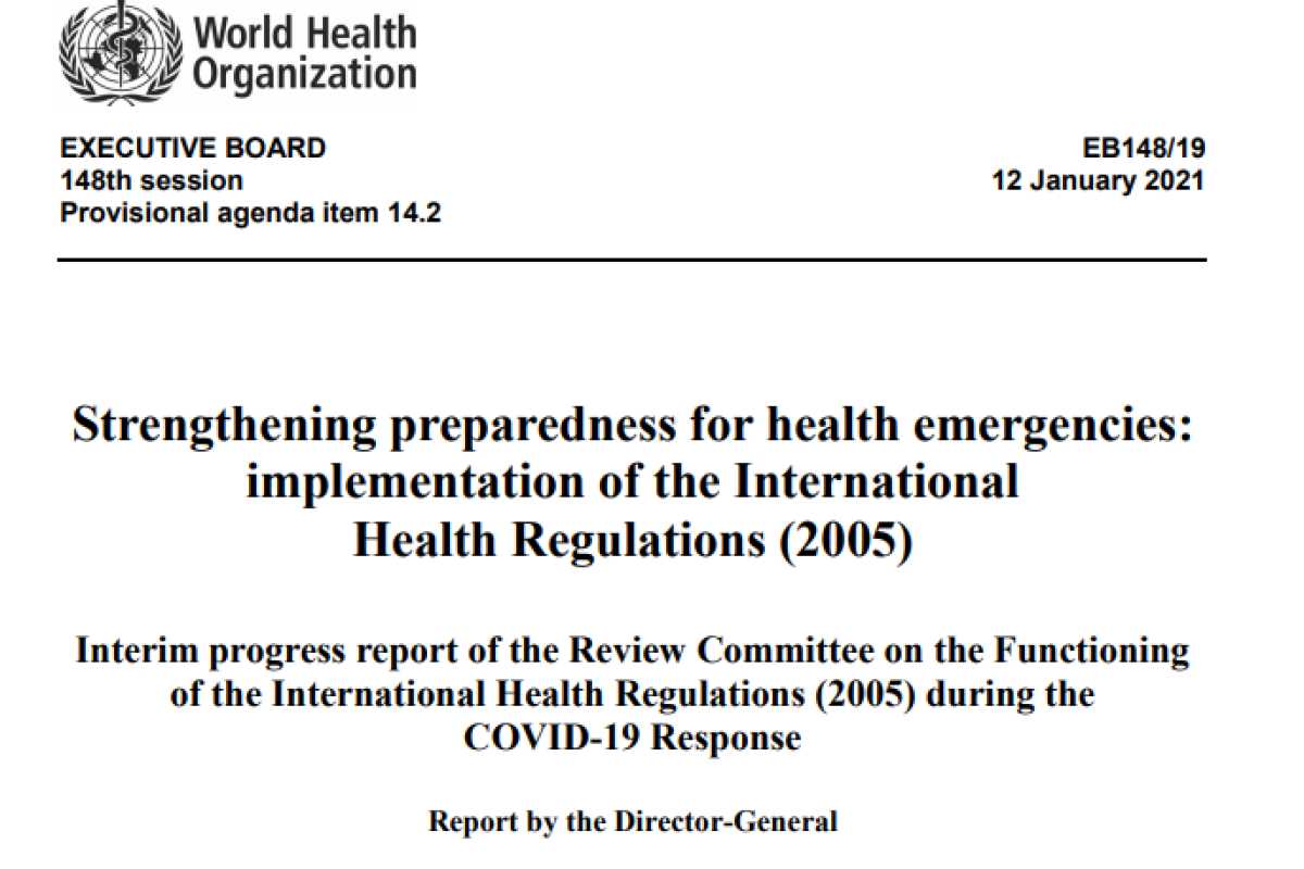 Pursuant to requests made by the Health Assembly in resolutions WHA73.1 and WHA73.8 (2020), the Director-General has the honour to transmit to the Executive Board at its 148th session the interim progress report of the Review Committee on the functioning of the International Health Regulations (2005) during the COVID-19 Response (at Annex).